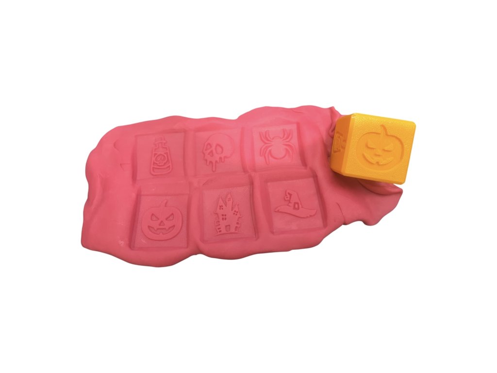 Jedná se o otiskávací kostku s různými motivy halloweenu, na každé straně je jeden obrázek, celkem tedy 6 obrázků, které můžete otisknout např. do plastelíny