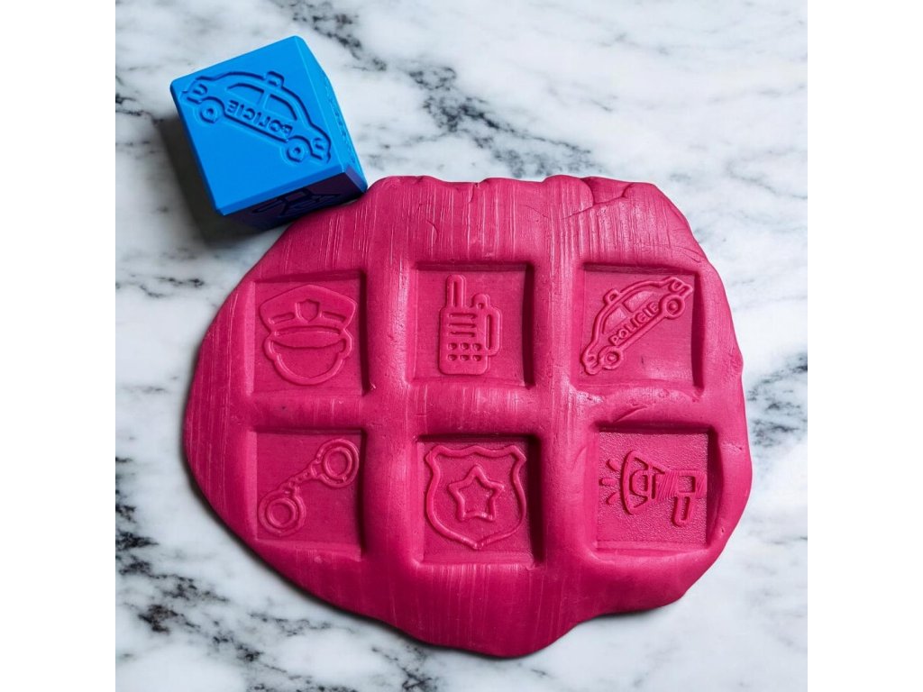 Jedná se o otiskávací kostku s různými motivy policie, na každé straně je jeden obrázek, celkem tedy 6 obrázků, které můžete otisknout např. do plastelíny